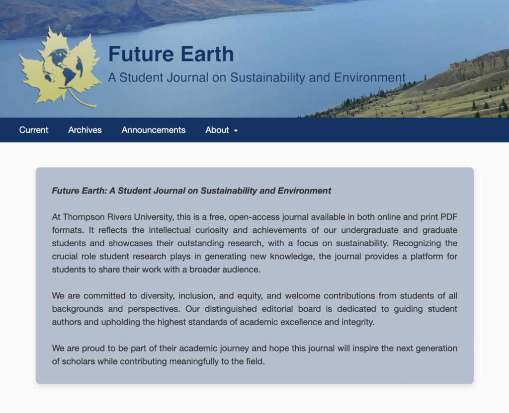 Future Earth follows a continuous publication model, accepting submissions year-round. TRU students are invited to submit research articles, creative works, or interdisciplinary projects for upcoming issues, with Volume 2, Issue 1 scheduled for Winter 2026. Faculty are also encouraged to recommend exceptional student work submitted for course assignments; our editorial team will collaborate with these students to prepare their work for publication in this faculty-reviewed journal. As submissions grow, the journal aims to publish two issues per year, further expanding opportunities for student authorship and engagement.