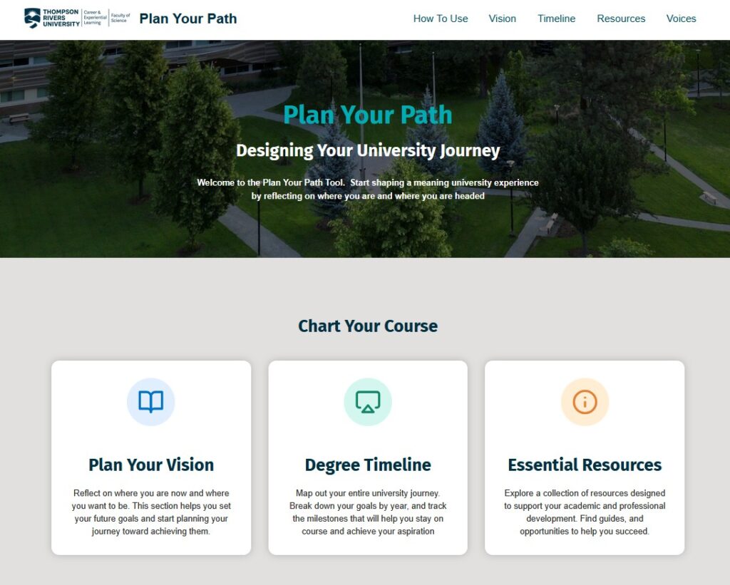 Developed in collaboration with Sarah and Lindsay by Samar Khajuria, TRU Open Press co-op student, Plan Your Path will be rolled out in January 2026 as both a website and an interactive activity. It allows users to map out their courses, extracurricular activities, co-op opportunities, and more, providing a clear framework to help them understand their academic goals and make informed decisions. By encouraging intentional goal-setting, the OER supports students in building the skills, habits, and mindset needed to align their university experience with their aspirations.