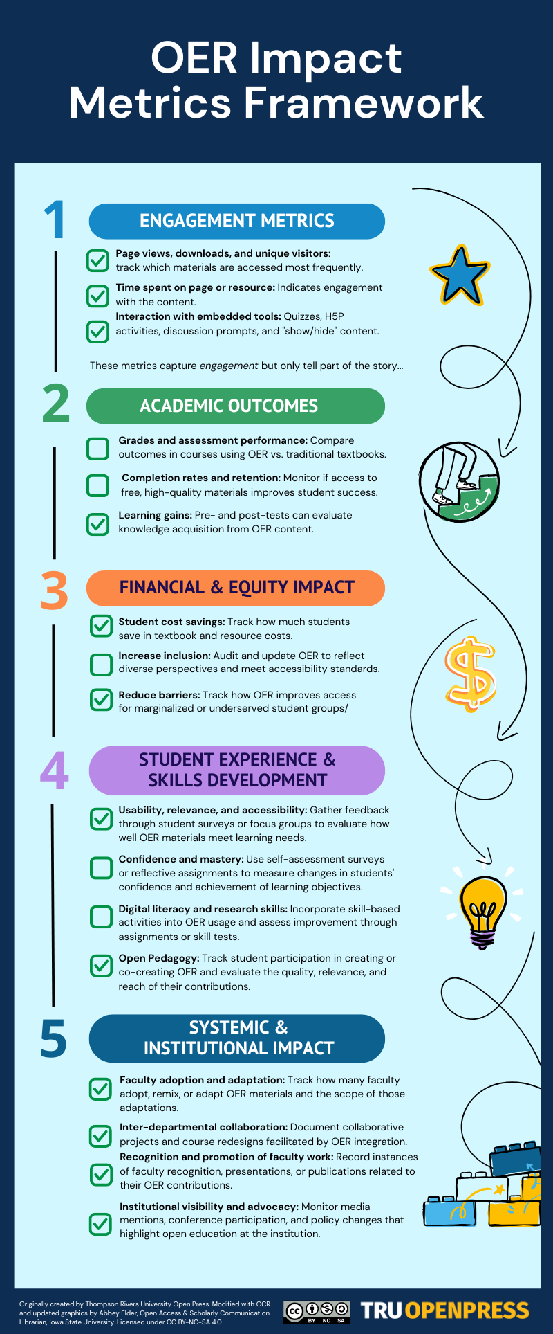 TRU Open Press is committed to understanding and demonstrating the impact of Open Educational Resources (OER) on students, faculty, and the broader institution. Our OER Impact Metrics Framework provides a structured approach to evaluate five key areas: engagement, academic outcomes, financial and equity impact, student experience and skills development, and systemic/institutional influence. By tracking metrics such as resource usage, learning gains, cost savings, faculty adoption, and participation in open pedagogy, we gain insights that help improve OER quality, accessibility, and reach. This framework ensures that our open resources are not only freely available but also meaningful, effective, and inclusive for learners and educators alike.