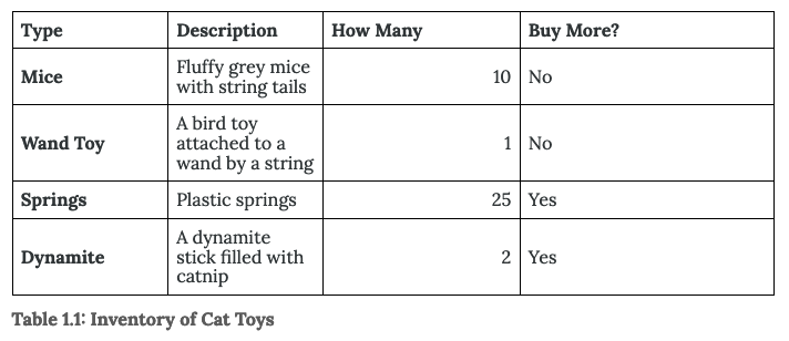 - Tables should have a numbered table title above the table. E.g., Table 1.1: Favourite Kitten Toys